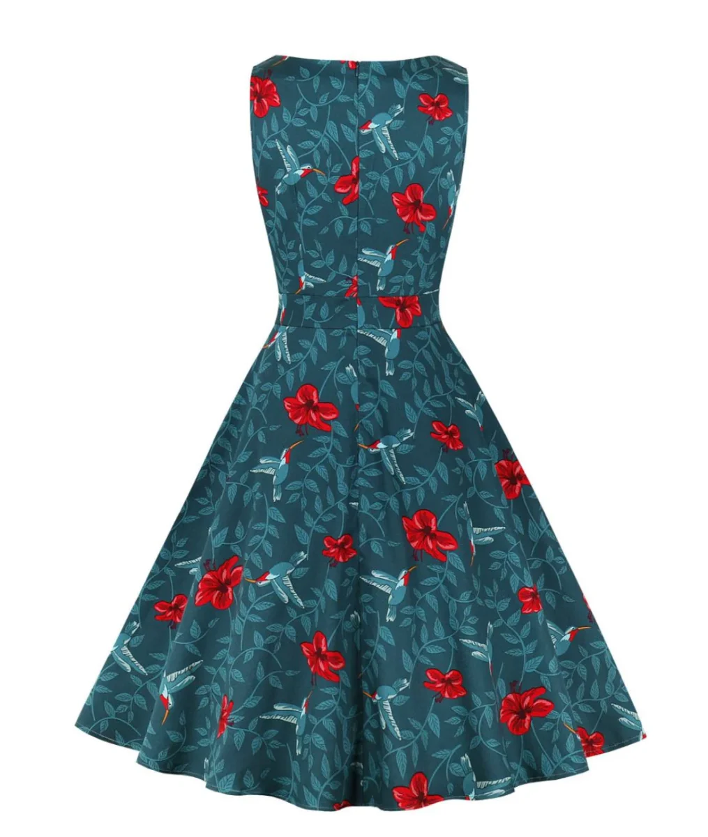 Remontez l’horloge de la mode jusqu’au milieu des années 1950, où le chic féminin régnait en maître et où les robes respiraient l’élégance pure et la séduction. Cette robe est une ambassadrice rendant honneur à ses ancêtres avec ses motifs rose rouges sur fond frais bleu. Une superbe robe à porter avec un chapeau de paille par exemple ! Elle saura sublimer vos formes sans effort avec sa coupe droite et ses motifs floraux et feuilles de lauriers légères.