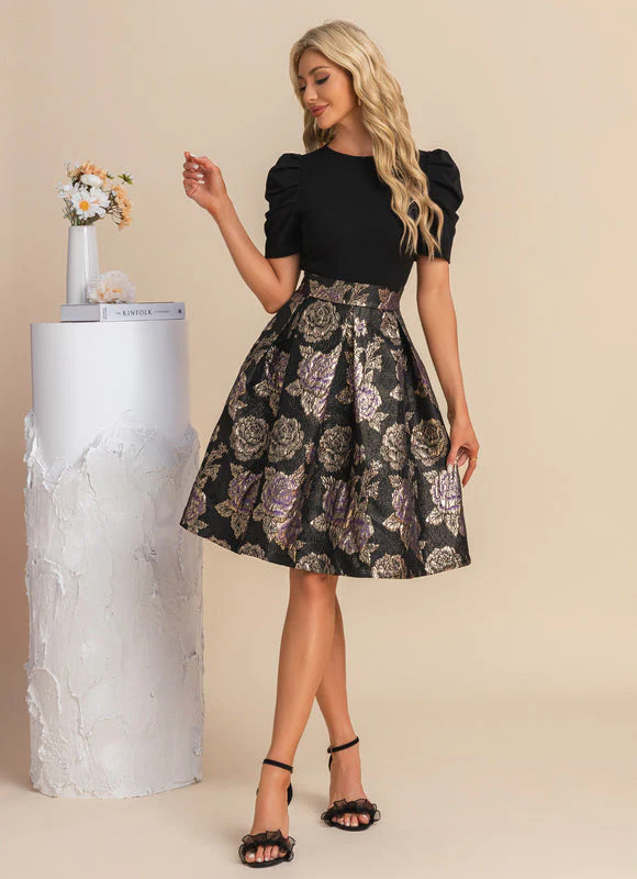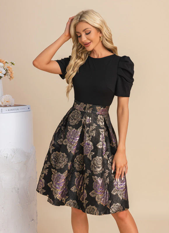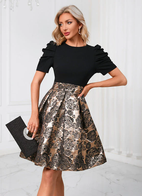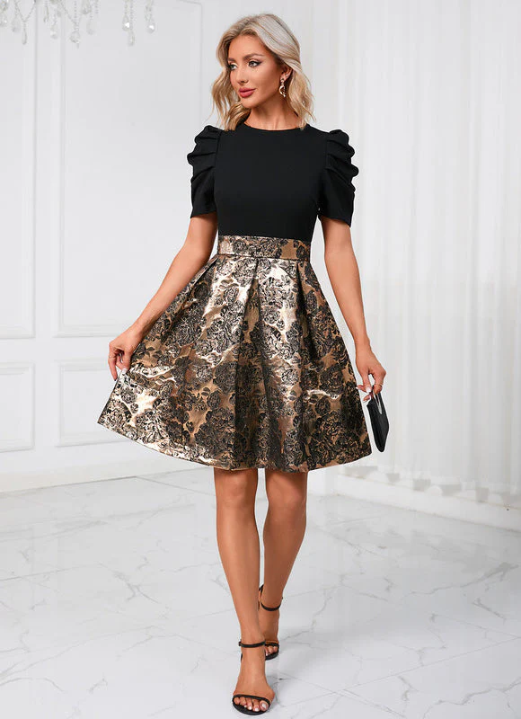 Découvrez notre somptueuse robe trapèze alliant élégance et raffinement. Le haut noir aux manches courtes bouffantes apporte une touche de modernité, tandis que la jupe plissée en jacquard doré crée un effet saisissant. La coupe trapèze met en valeur votre silhouette en soulignant la taille avec une jupe qui s’évase délicatement au-dessus des genoux, idéale pour toutes les morphologies.