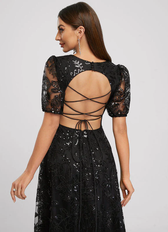 Laissez-vous séduire par notre sublime robe trapèze noire qui allie élégance et audace. Sa coupe mi-longue évasée met en valeur votre silhouette tout en offrant une aisance de mouvement incomparable. Le tissu en dentelle scintillante capture la lumière grâce à ses paillettes subtilement intégrées, tandis que le dos ouvert avec laçage croisé révèle juste ce qu’il faut pour un effet sensuel mais raffiné.