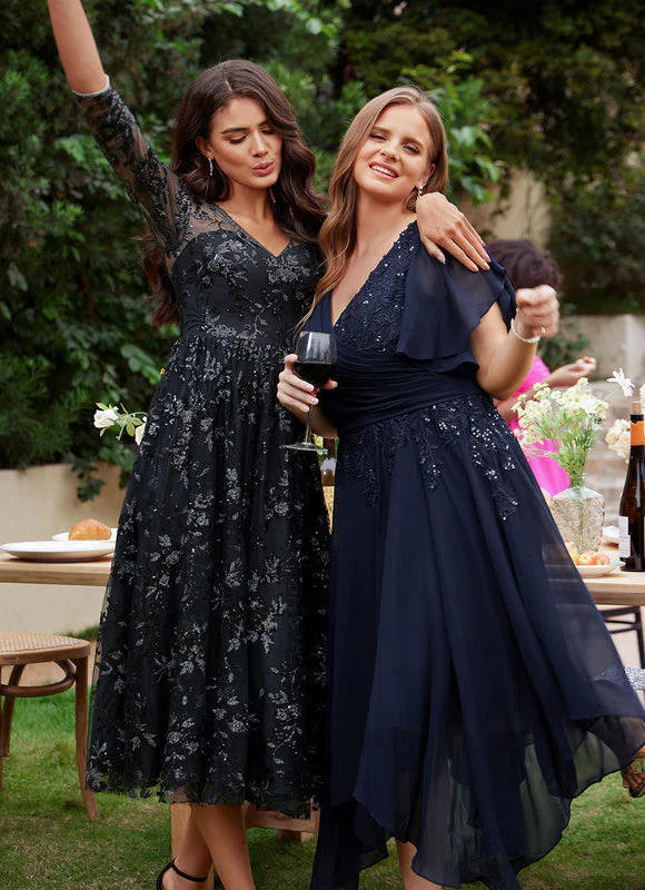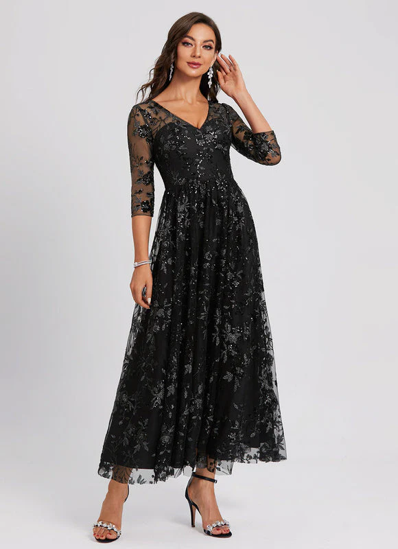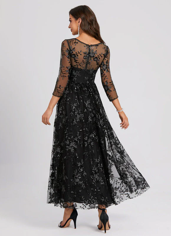Découvrez notre sublime robe trapèze noire ornée d’une dentelle florale scintillante qui capturera tous les regards. Avec son décolleté en V flatteur et ses manches trois-quarts transparentes, cette création allie parfaitement élégance et sensualité. La silhouette trapèze évasée met en valeur votre taille tout en offrant une ampleur gracieuse qui virevolte à chacun de vos mouvements. Les délicats motifs floraux argentés brodés sur le tulle noir créent un contraste saisissant qui ajoute une dimension de sophistication à cette robe de longueur cheville.