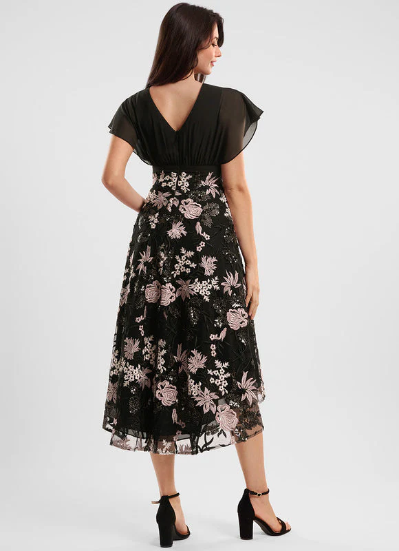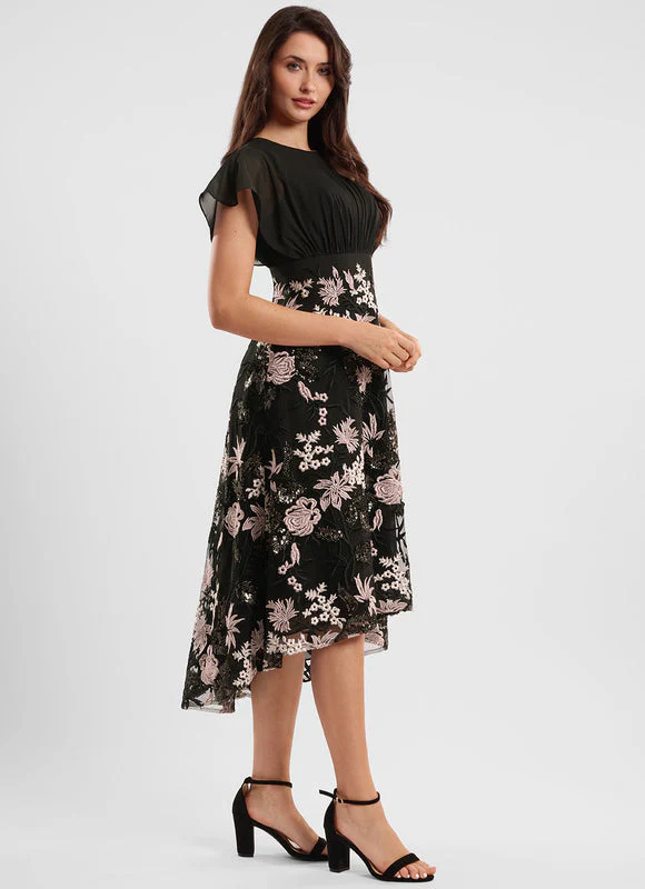Cette robe polyvalente est conçue pour vous faire sentir belle et confiante, quelle que soit l’occasion. Sa coupe vous offre un confort optimal tout au long de la journée ou de la soirée, tandis que ses détails floraux attireront tous les regards. Le contraste entre le haut en mousseline noire transparente et la jupe ornée de broderies florales roses crée un ensemble parfaitement équilibré et élégant.