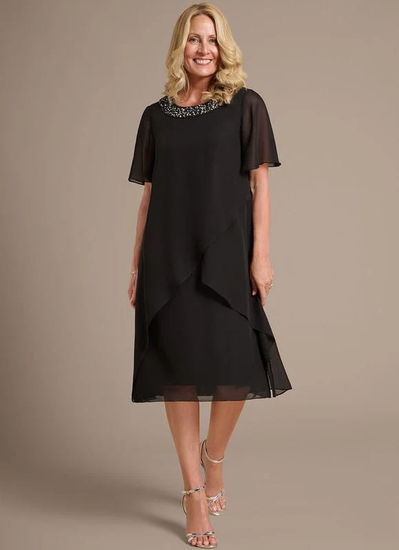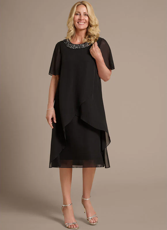 Découvrez notre robe trapèze noire alliant élégance et modernité. Son encolure ornée de perles et paillettes argentées apporte une touche de sophistication qui attire tous les regards. Sa coupe trapèze flatteuse convient à toutes les morphologies, tandis que ses manches évasées en mousseline transparente ajoutent légèreté et mouvement. Le drapé asymétrique sur le devant crée un effet cascade qui allonge la silhouette, avec une longueur midi parfaitement élégante pour toutes vos occasions spéciales.