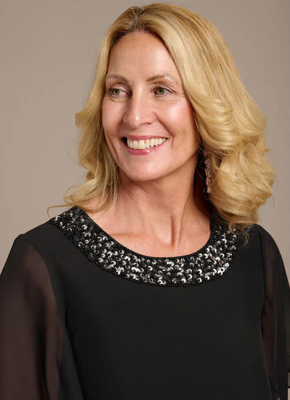 - ✦ Col rond orné de perles et paillettes argentées pour un effet bijou sophistiqué