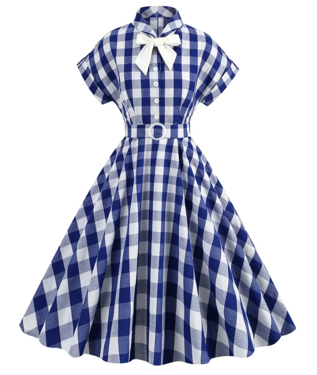 Les robes en vichy sont parmi les plus représentatives de l’époque vintage, et surtout, elles figurent parmi les plus appréciées des années 60 à cause de leur caractère gracieux et plein d’audace, mais tout ne légèreté. Les motifs à carreaux sertis d’une couleur telle que le rose et le bleu sont souvent les plus représentatives de ces tenues. Notre modèle de robe vintage des années 60 vichy ici présente est ornée de manches courtes, d’une ceinture assortie au modèle choisi et d’un noeud papillon de type lavallière au niveau du cou, ainsi que d’un col à retrousser pour un effet robe chemise des plus désirables aux yeux de tous ! Elle est aussi dotée d’une fermeture éclair au dos moderne pour un maintient impeccable.