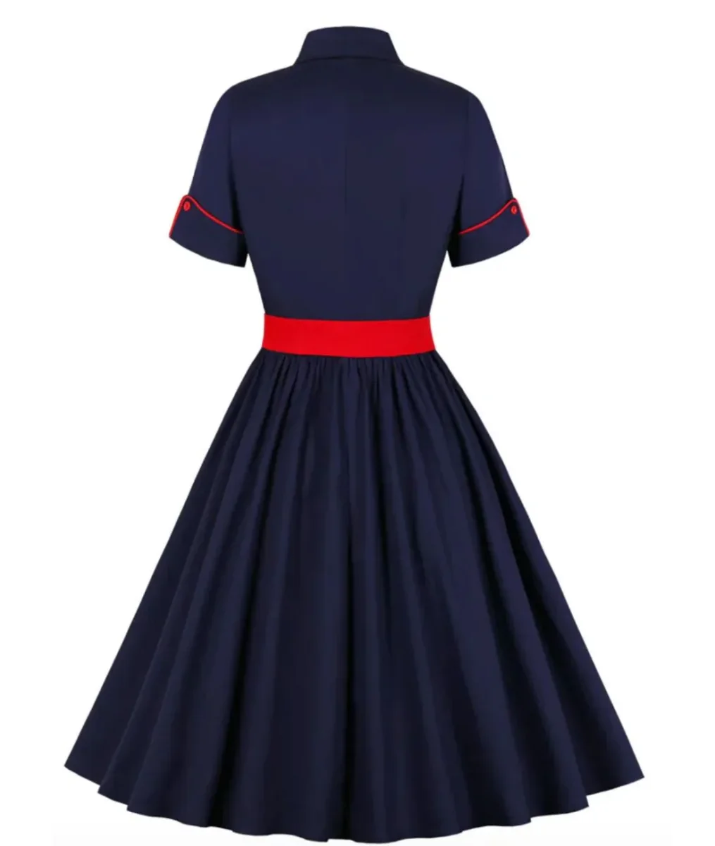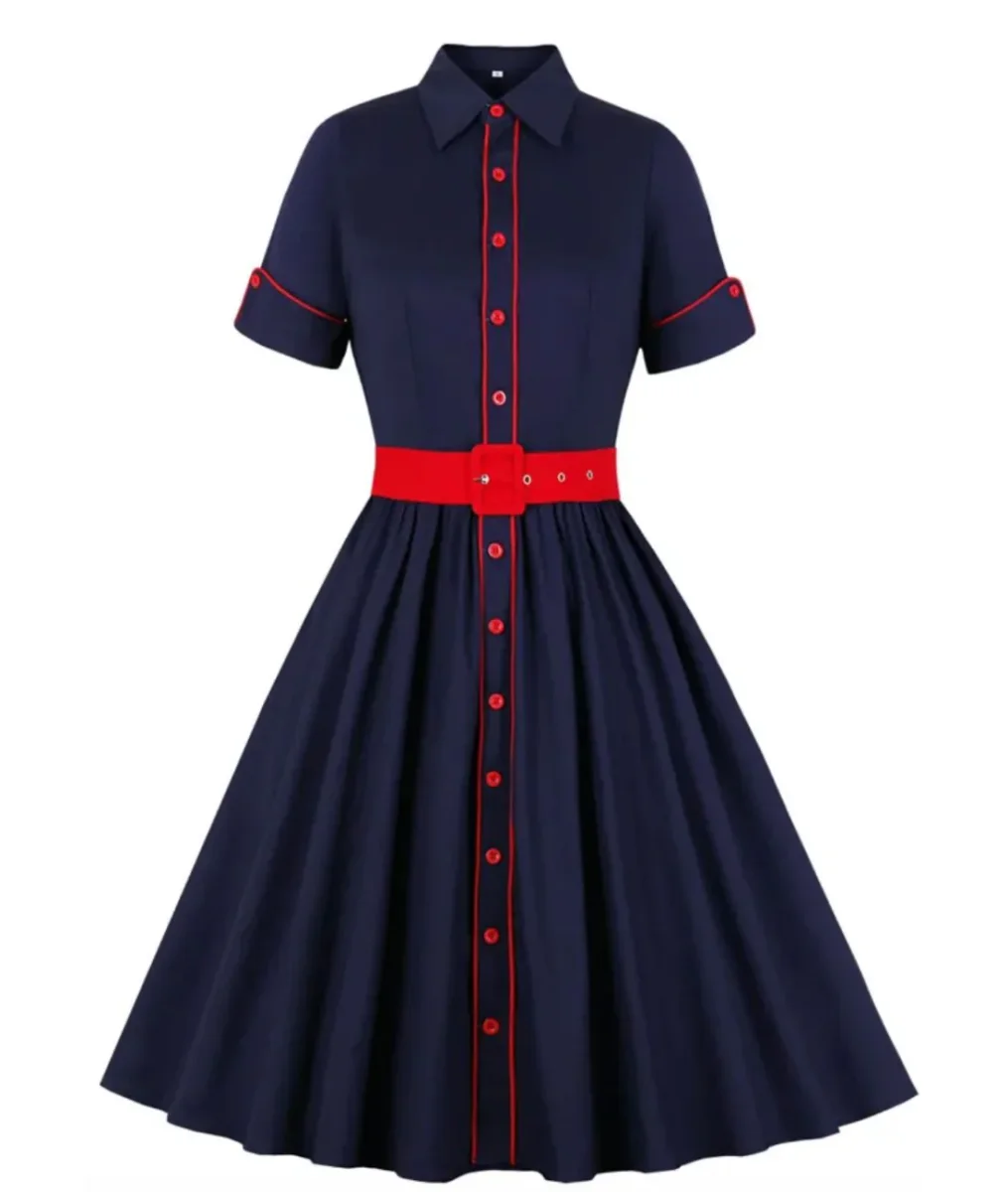 Présentant une coupe classique pour une robe des années 40, avec un col retroussé et une longue double bande parallèle qui descend du col à la fin de l’ourlet ample, cette robe offre divers contrastes de rouge et bleu marine adorables et habillés. Du rouge finement dispersé aux manches courtes, mais aussi sur la ceinture, et au niveau des boutons d’attache.