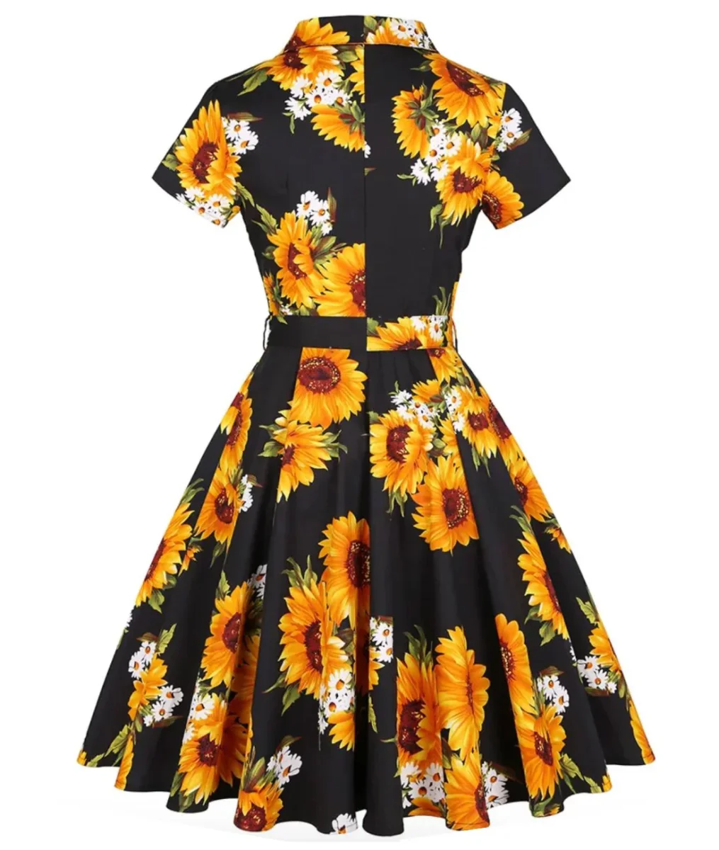 D’un look des années 50 avec de jolis tournesols, ces jolies fleurs de l’été typiques d’une journée pleine de vitamine D et d’un apéro en terrasse en bord de mer ou accoudée à un bar sympa d’une jolie petite ville de campagne avec vos amis autour de vous ou votre famille, cette belle robe respire la joie de vivre à tout moment !