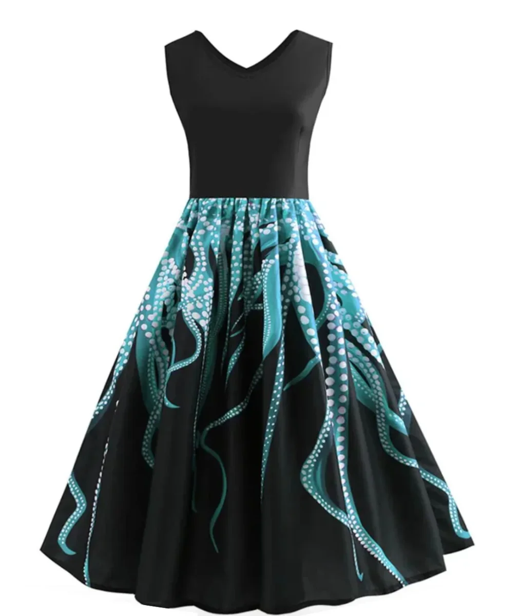 Les robes longues sont incontournables pour l’été ! Cette robe des années 50 est droite au buste avec un col en V courbé, et la jupe au bas est ample. Maintenant, vous pouvez aisément obtenir une superbe tenue vintage des années 1950. La jupe arbore des motifs tentacules de pieuvre bleue fantaisiste, sortis d’un doux […]