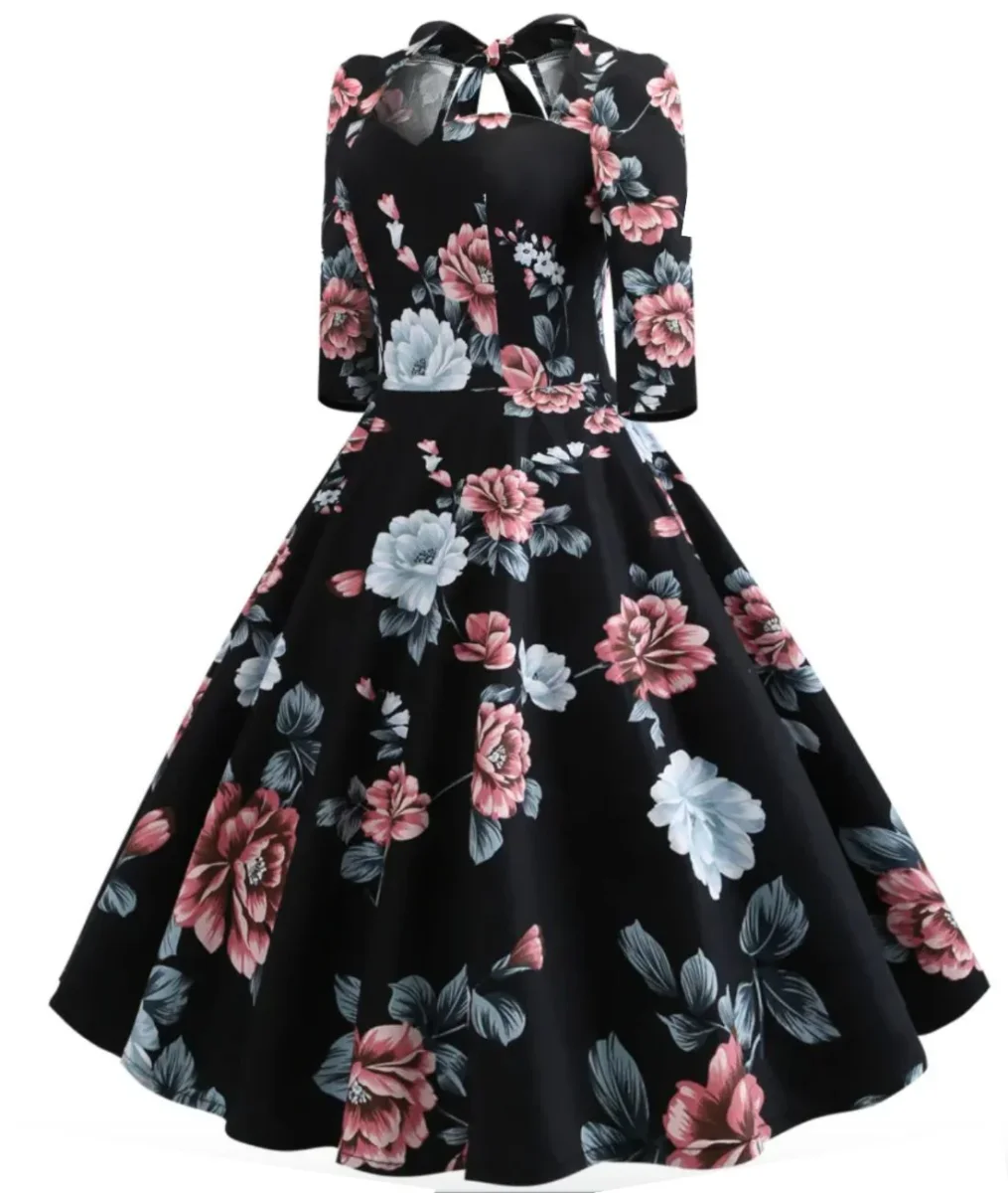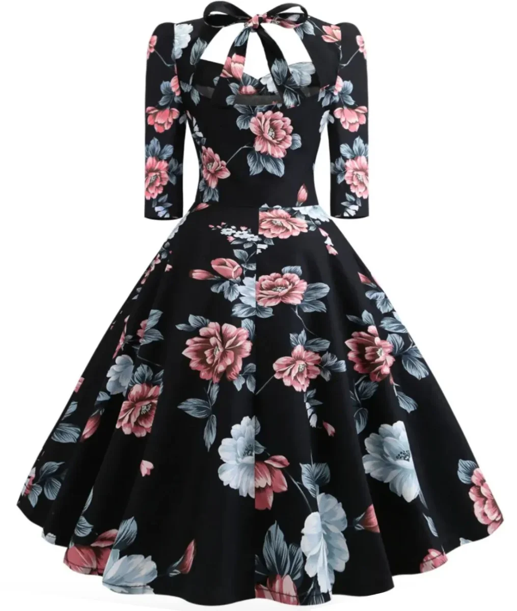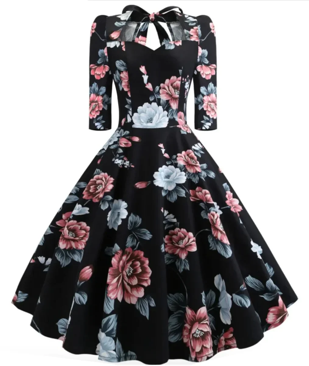 Sa belle coupe évasée et ses superbes motifs floraux blanc bleutés, rose foncé et ses feuilles de rosier vert foncés sont de superbes imprimés de l’époque vintage, sublimés sur un tissu moderne en vogue. le mélange des deux univers révèle un adorable style vestimentaire à porter sur vous pour honorer le style d’antan mais toujours aussi intemporel ! Portez-le avec un bandeau de pin up noir pour accentuer l’air vintage.