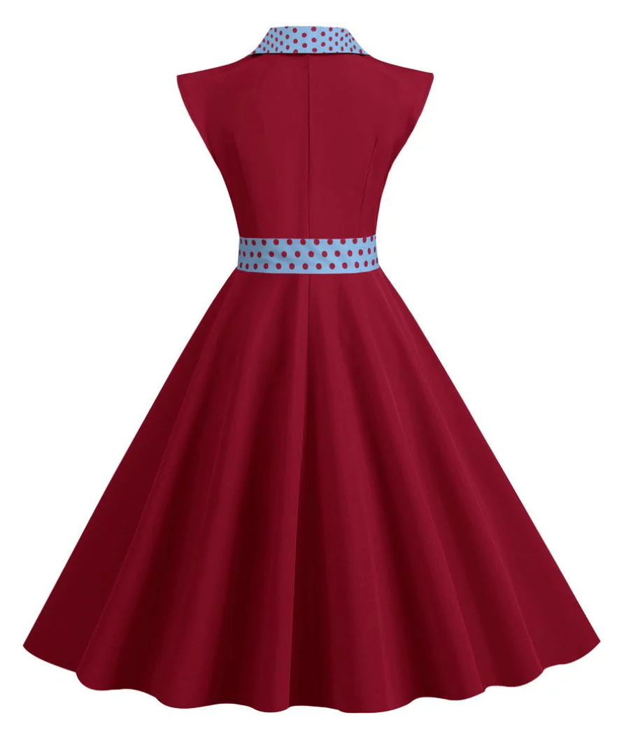 Cette jolie robe rouge et bleu ciel offre un look adorable et résolument tourné vers le vintage !