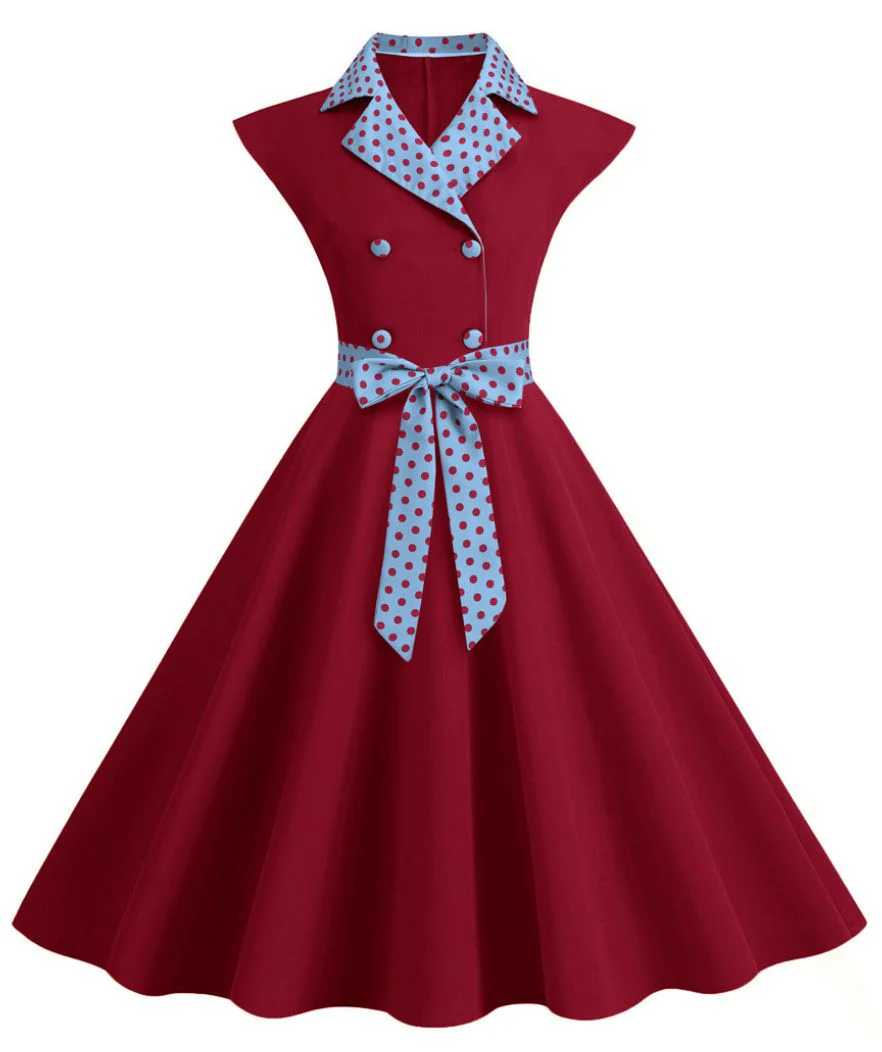 Vous ne pouvez pas vous tromper en faisant le choix d’opter pour cette robe décontractée, flatteuse et polyvalente en terme d’occasions de la porter ! Elle a tout ce dont vous avez besoin : un design élégant et confortable de la tête aux bas des jambes, des boutons par quatre intégrés au niveau du ventre, des manches très courtes pour incarner le style années 50, tandis que l’imprimé pois rouge sur le col bleu ciel et le ruban de fermeture apporte un peu de décalage et de contraste à look. Le buste croisé par les boutons offre par une attache pour vous éviter de vous inquiéter qu’il se défasse. C’est la robe parfaite pour une journée décontractée, que ce soit au travail ou pour aller au restaurant, ou vous balader dans la rue.
