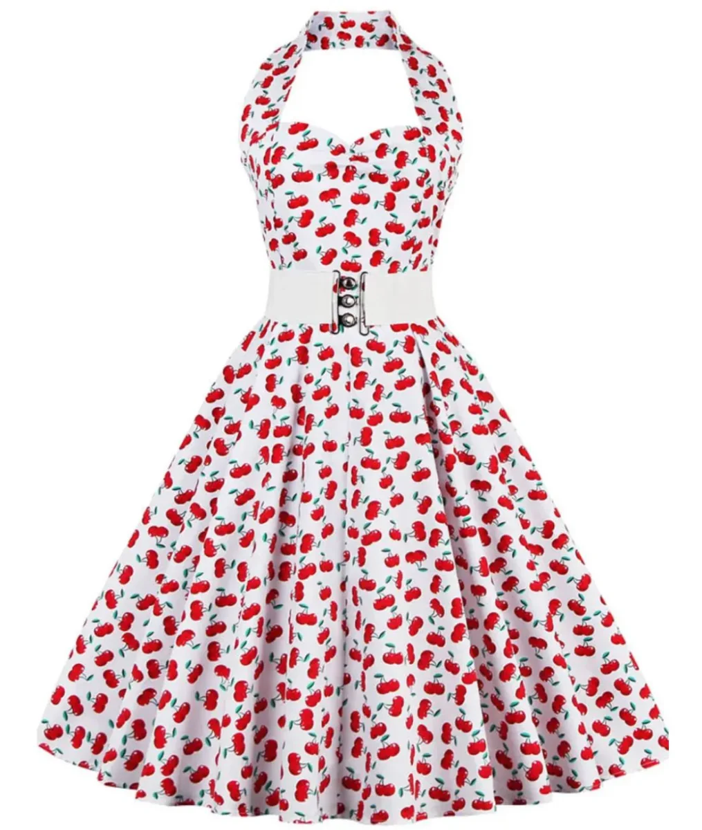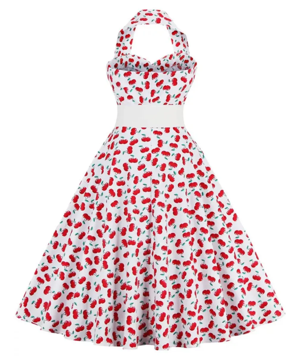Une manière originale de nos jours de placer sa robe sur soi, mais toujours aussi flatteuse pour la silhouette féminine ! Elle est parsemée de cerises tout le long de la robe, même sur l’encolure ! Une vraie robe de printemps bohème, qui dispose d’une ceinture blanche à passants pour resserrer la taille confortablement.