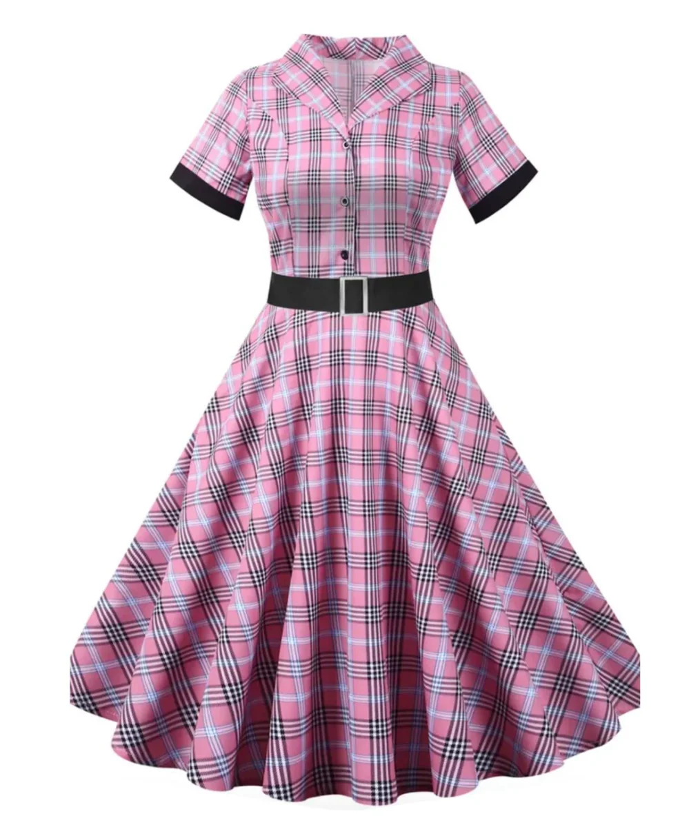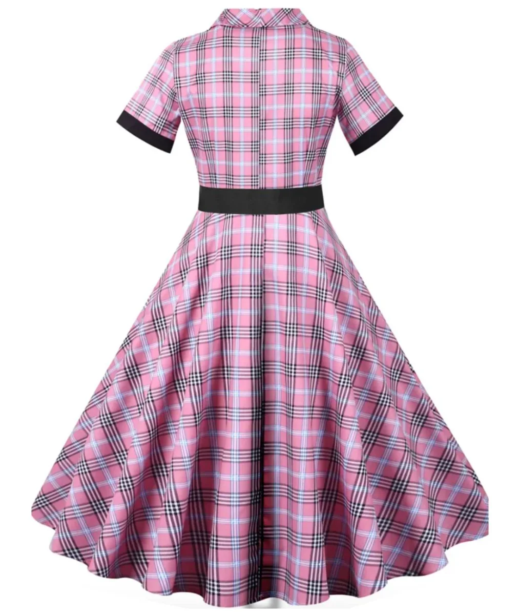 Cette robe année 40 rose est un joyau vintage qui attire l’attention avec son motif à carreaux éclatant et doux.