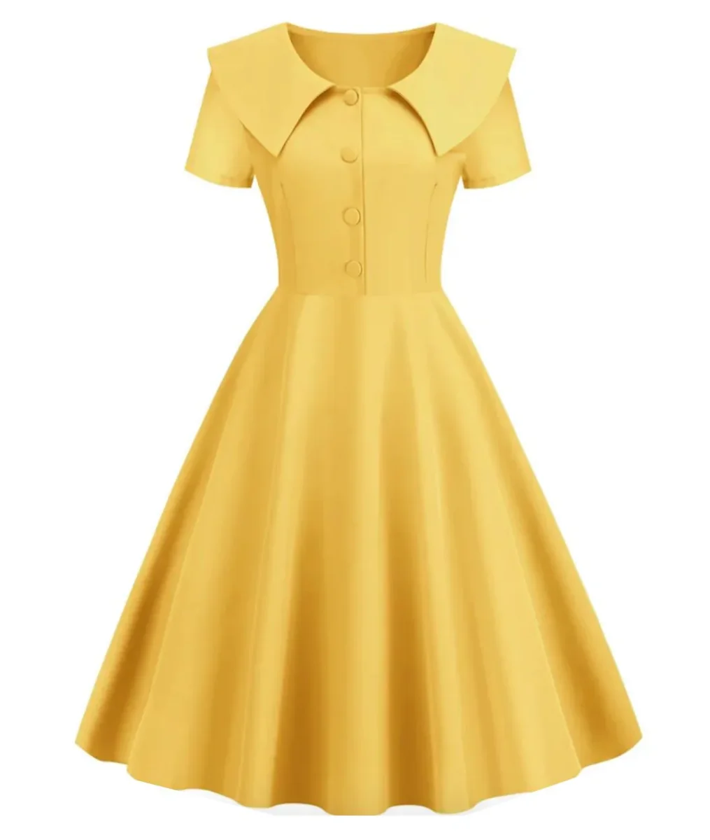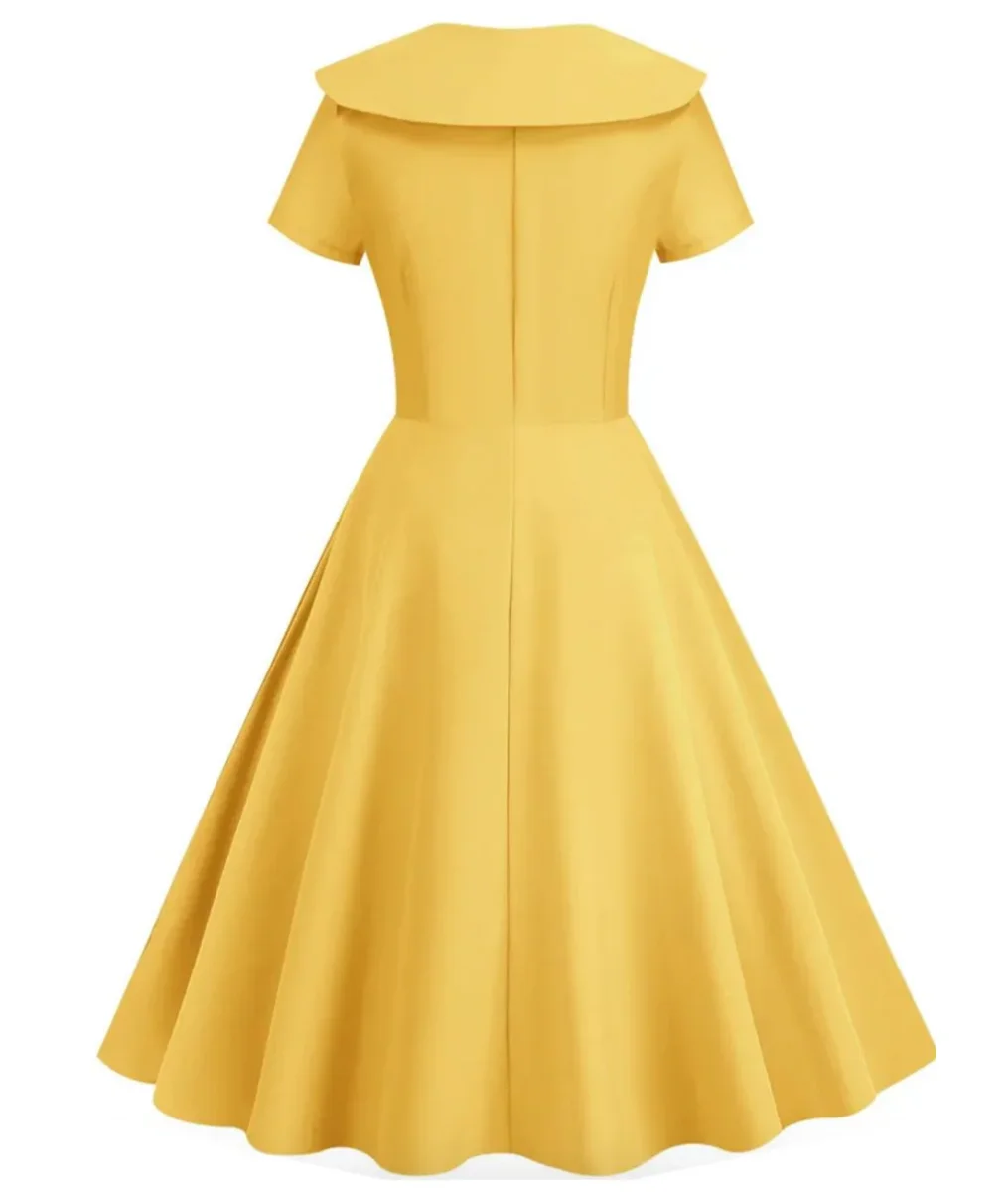 Avec notre robe pin up grande taille de couleur jaune, vous aurez l’avantage en plus de bénéficier d’une silhouette en sablier avec cette grâce à sa rangée de boutons cintrés au centre. Cette robe ondulée est coupée dans une forme crayon d’inspiration vintage. Au dos, une séduisante silhouette se dessine avec beaucoup d’élégance tant sa coupe peu évasée suit vos courbes en ajoutant du glamour à chacun de vos pas.
