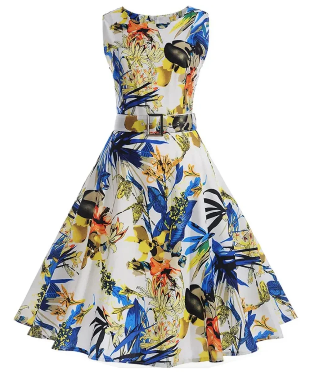 L’été arrive, et cette robe pin up à l’imprimé floral jaune et bleu est idéale pour une fête d’été.