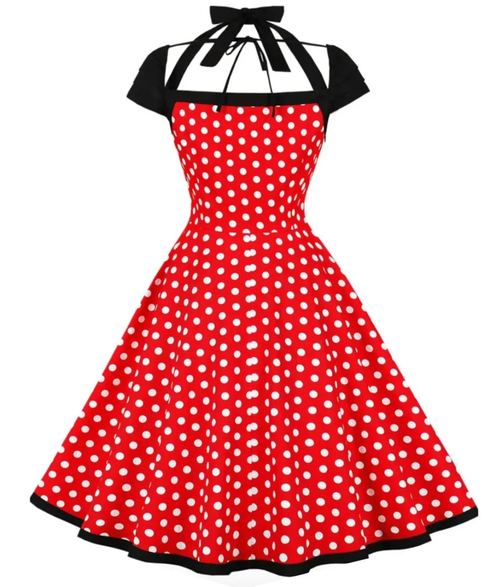 Cette robe rouge vermeil à pois pin up est conçue pour vous transformer en une sirène séduisante prête à prendre le contrôle de votre soirée. De face, vous êtes élégante et sophistiquée dans une jupe moulante à la silhouette en sablier vintage dans un tissu moderne des plus flatteurs, et elle est dotée d’une double bretelle à nouer derrière le cou et deux boutons décoratifs noirs. Tournez ensuite autour de vous pour être époustouflante !