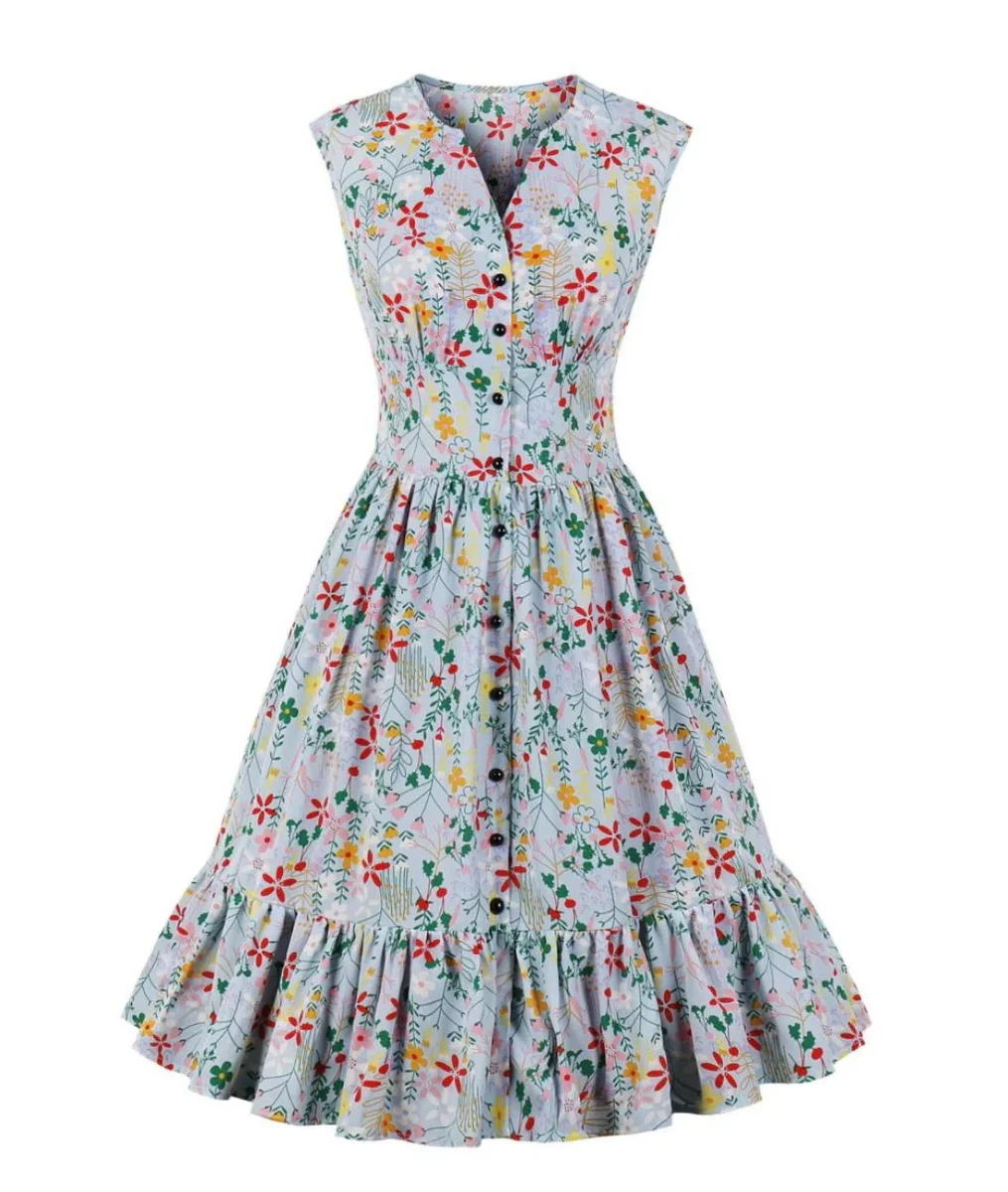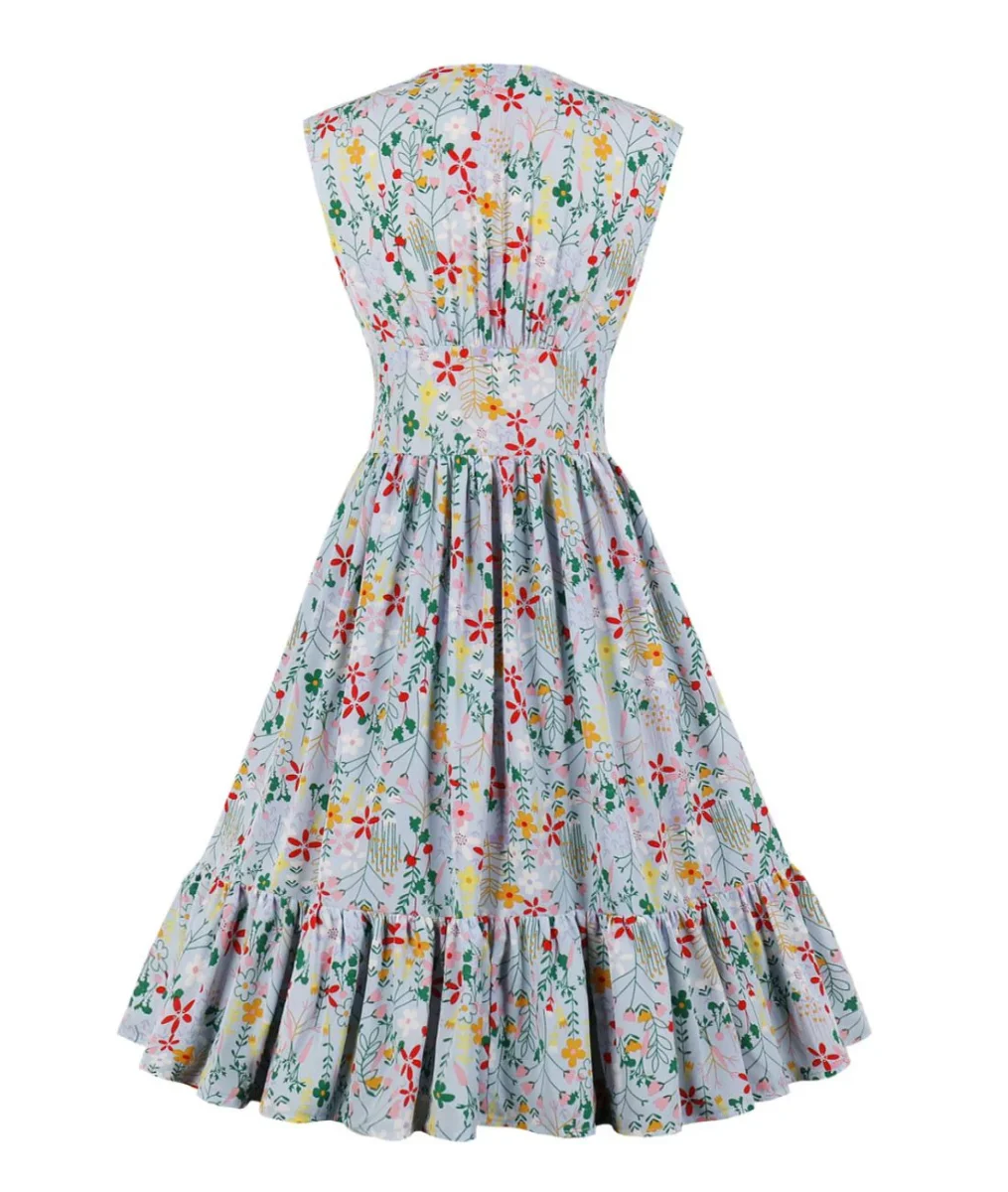 Découvrez cette ravissante robe de pin up à teinte bleu pastel délicate, ornée de fines fleurs multicolores des champs printaniers.