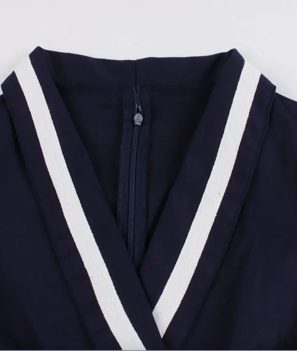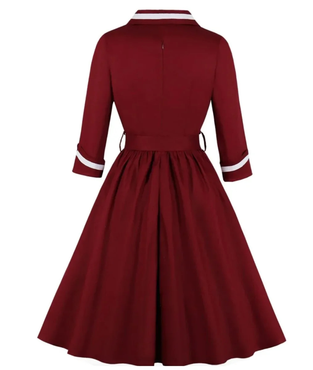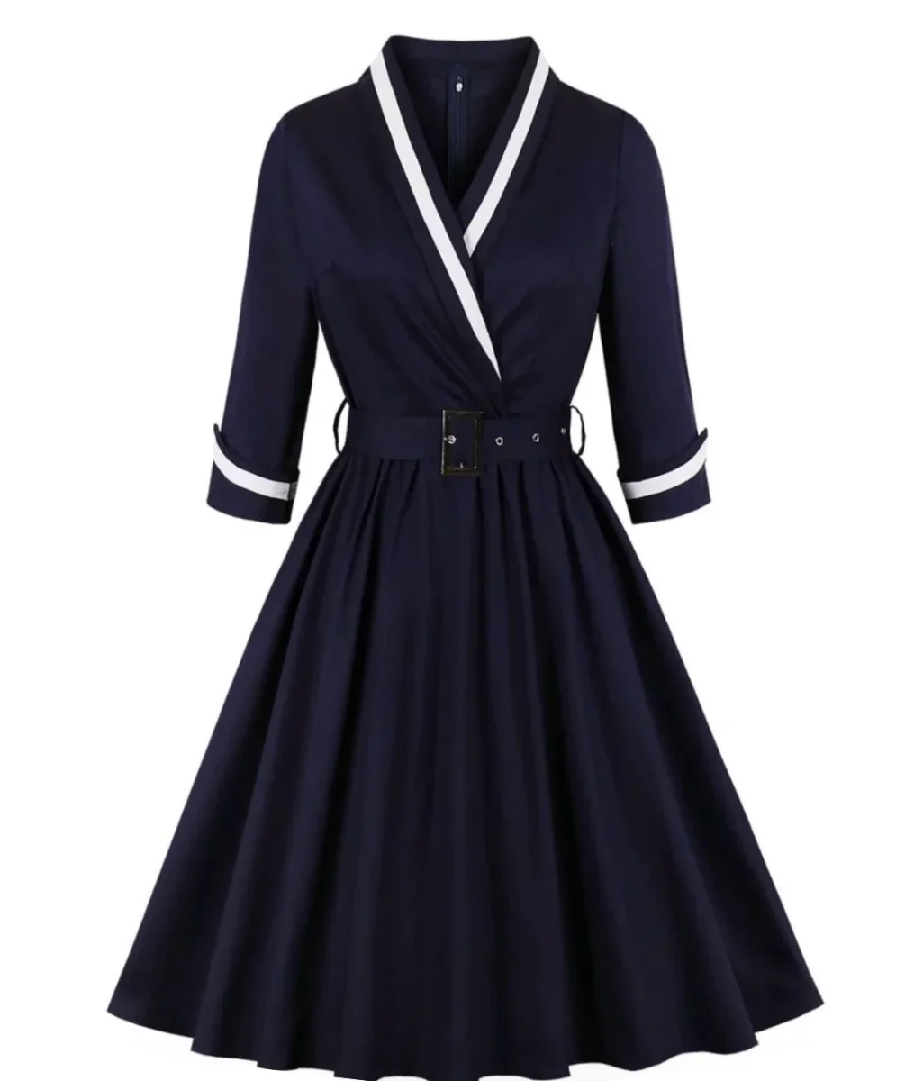 Disponible en deux couleurs rouge et bleu marine, elles ont cependant le même trait blanc en bordure du cou et du décolleté, et sur les bouts des poignets ! Cette jolie robe cache coeur des années 40 possède des manches au trois quarts et une coupe plissée à partir des hanches, contrastant avec la coupe droite du haut du buste.