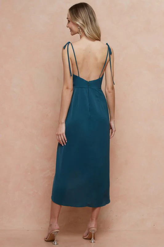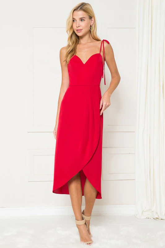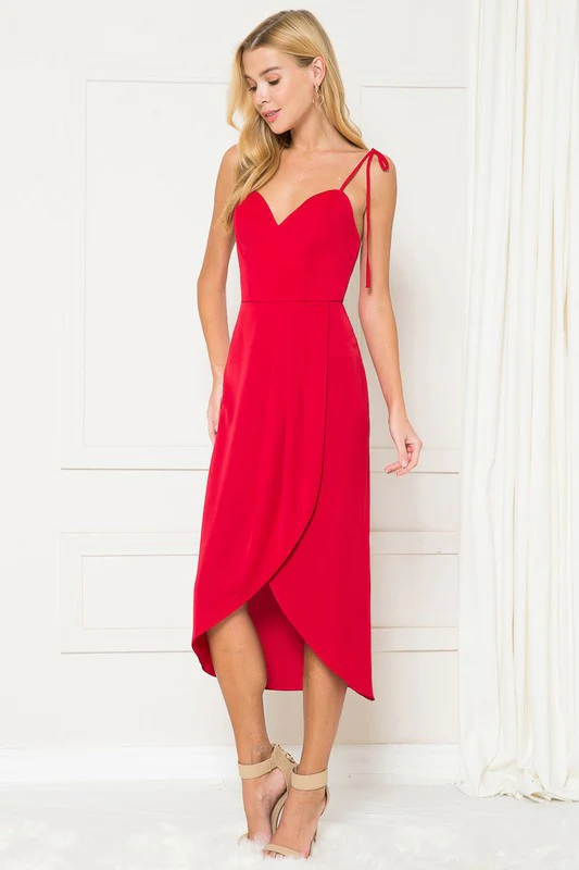 Robe en chiffon fluide de type portefeuille. Ses bretelles spaghettis sont ajustables puisque vous pourrez faire votre noeud à votre guise. La longueur de sa jupe est de 25 po devant et 33 po derrière (à partir de la taille). Elle permet un look chic pour un événement élégant.