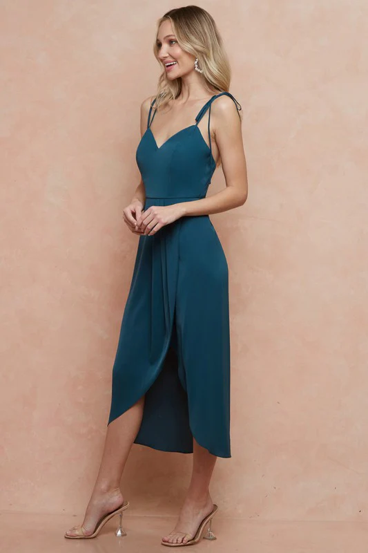 Wrap-style flowing chiffon dress. Its spaghetti straps are adjustable so you can tie your knot as you wish. Her skirt length is 25 inches for the front and 33 inches for the back (from the waist). It allows a chic look for an elegant event.