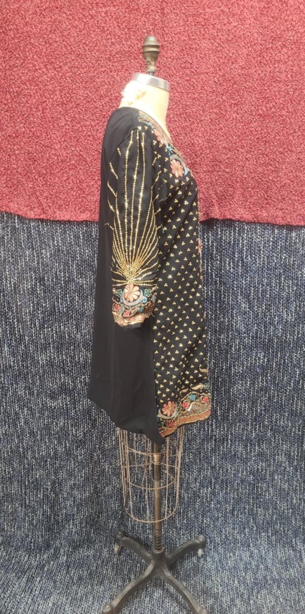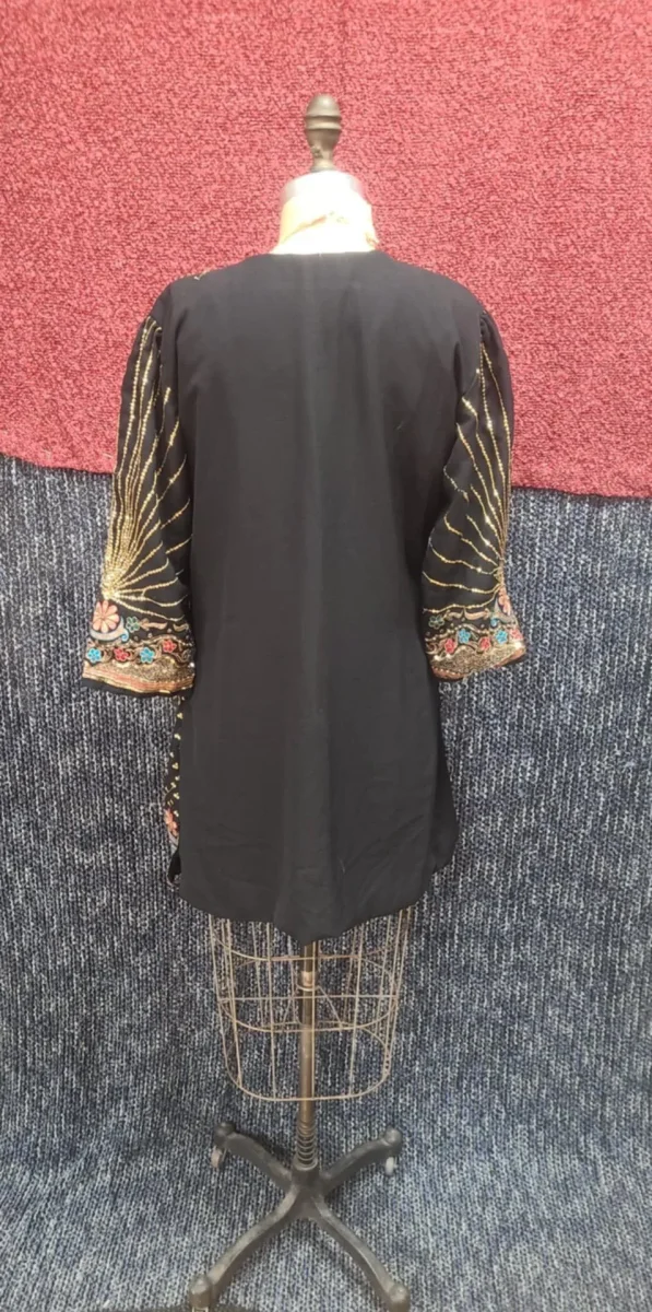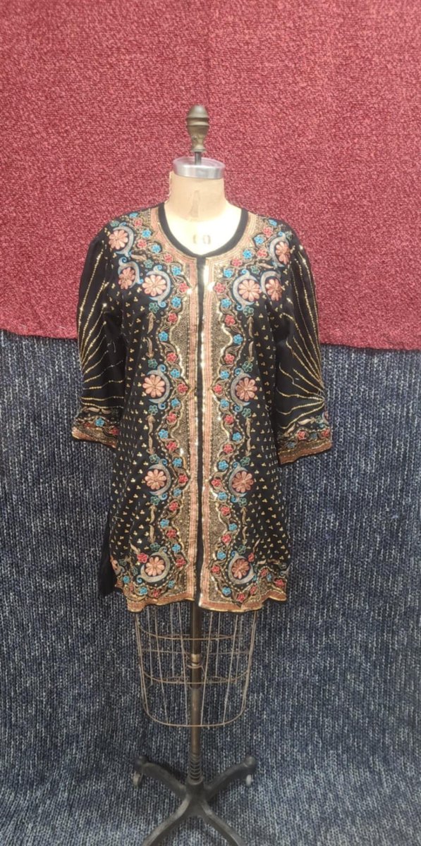 Magnifique pièce vintage ! Tunique à manches 3/4, légèrement évasée. Boutonnière invisible au devant. Encolure ronde près du cou. Brodée et perlée de fils et paillettes dorées. Fendue chaque côté au niveau des hanches. Avec quelques touches de bleu et de rouge. Quelques traces d’usure. Quelques paillettes manquantes mais se camoufle dans l’ensemble de l’oeuvre.