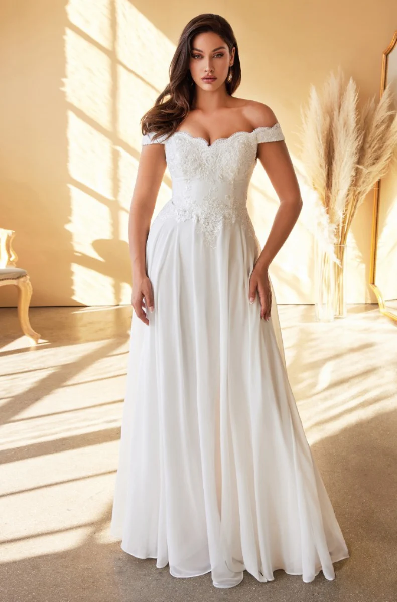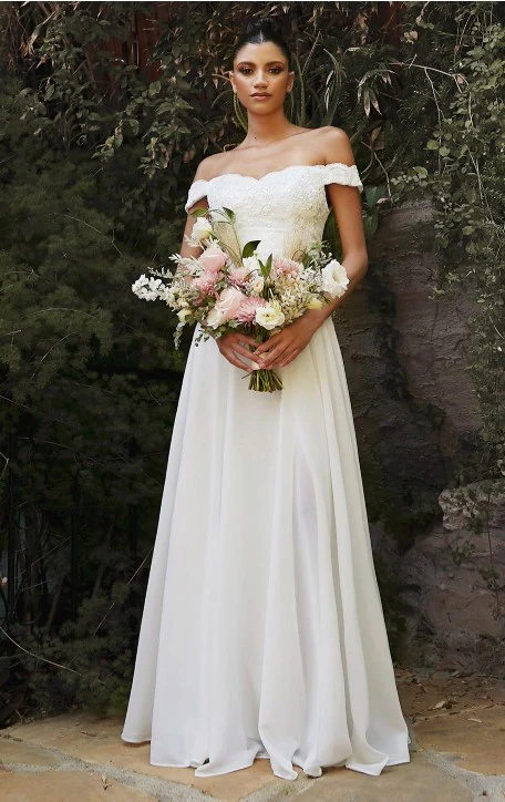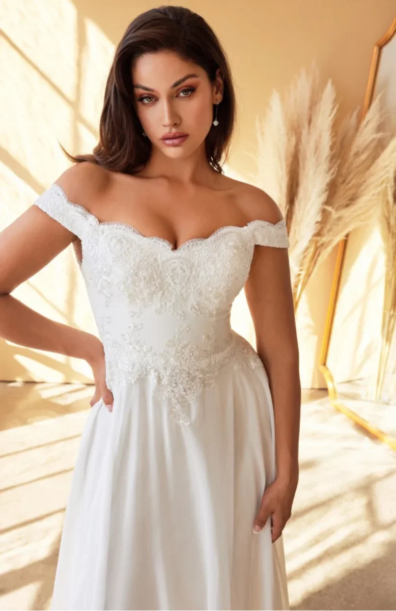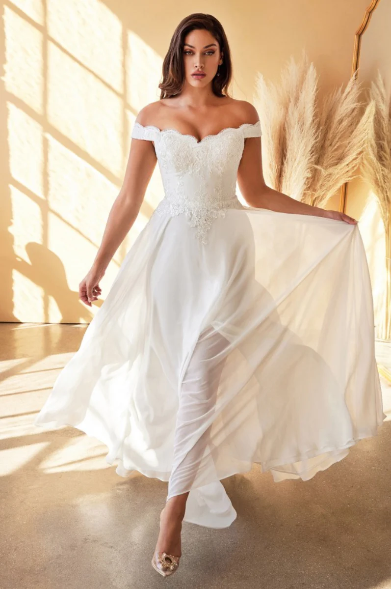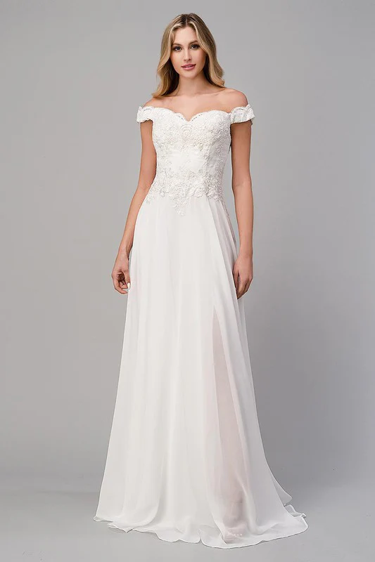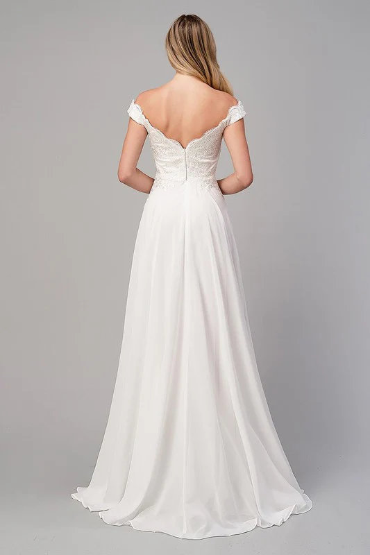 Off the shoulder lace bodice gown with flowy chiffon bottom and leg slit in lining.
