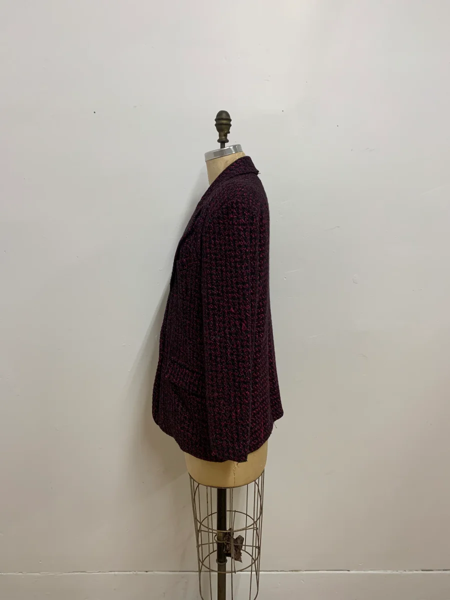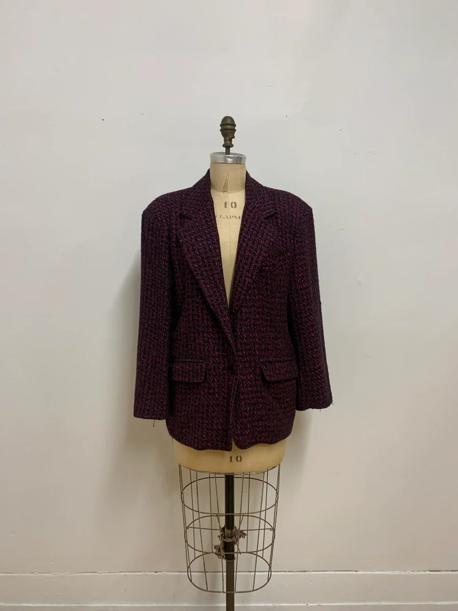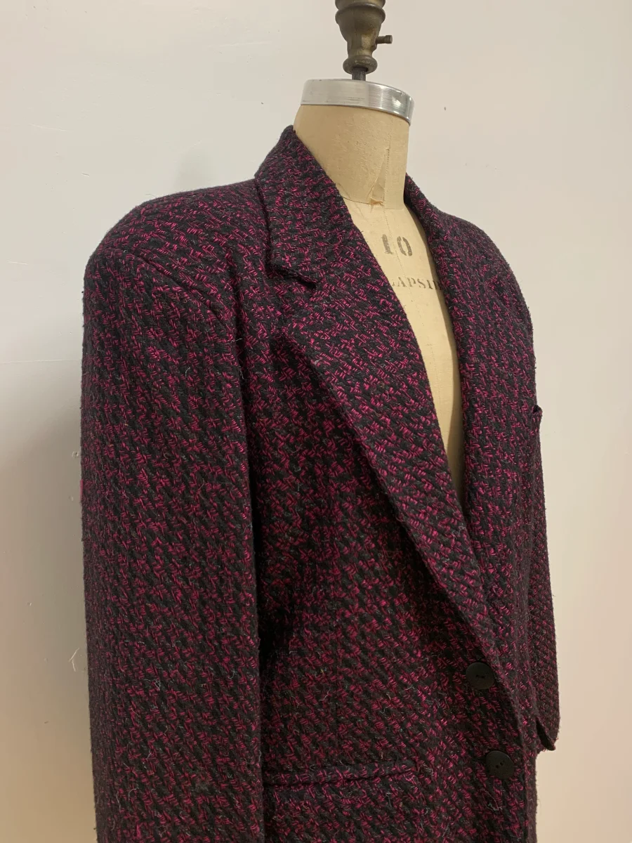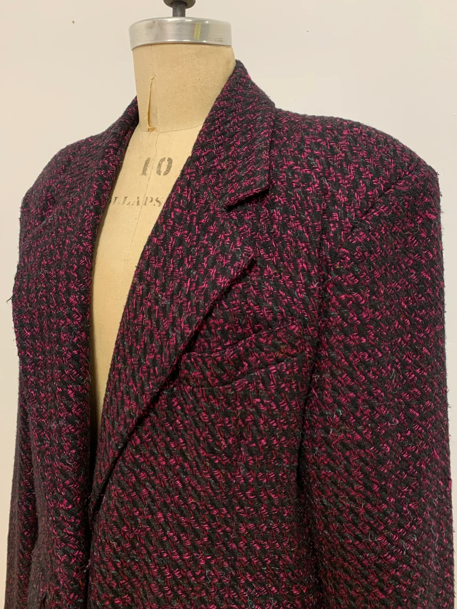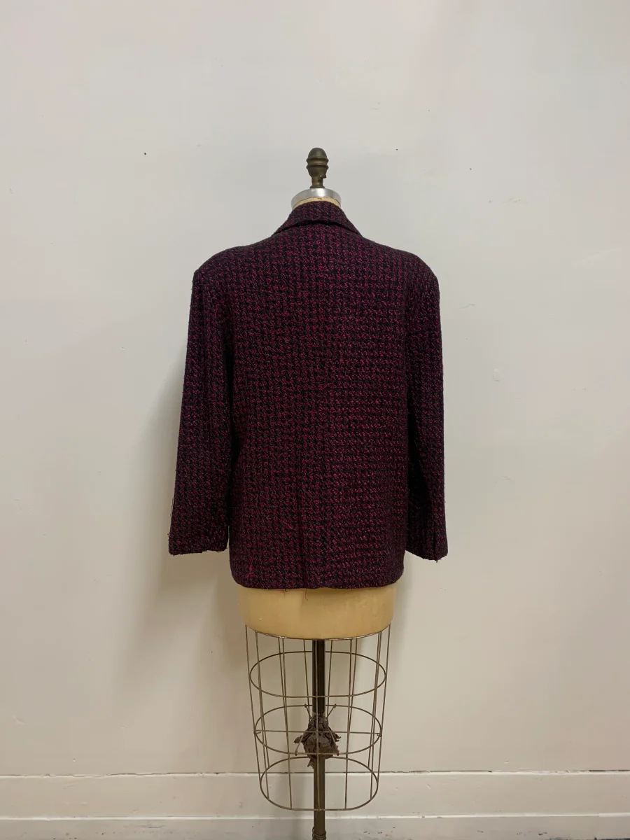 Veston de laine noir et fuchsia à motifs pied-de-poule de la marque Della Piga. En assez bon état vintage. Un veston parfait pour transitionner vers la saison plus froide.