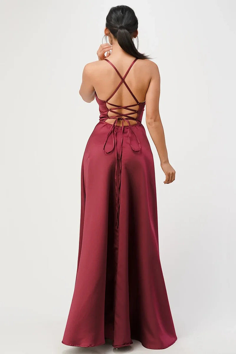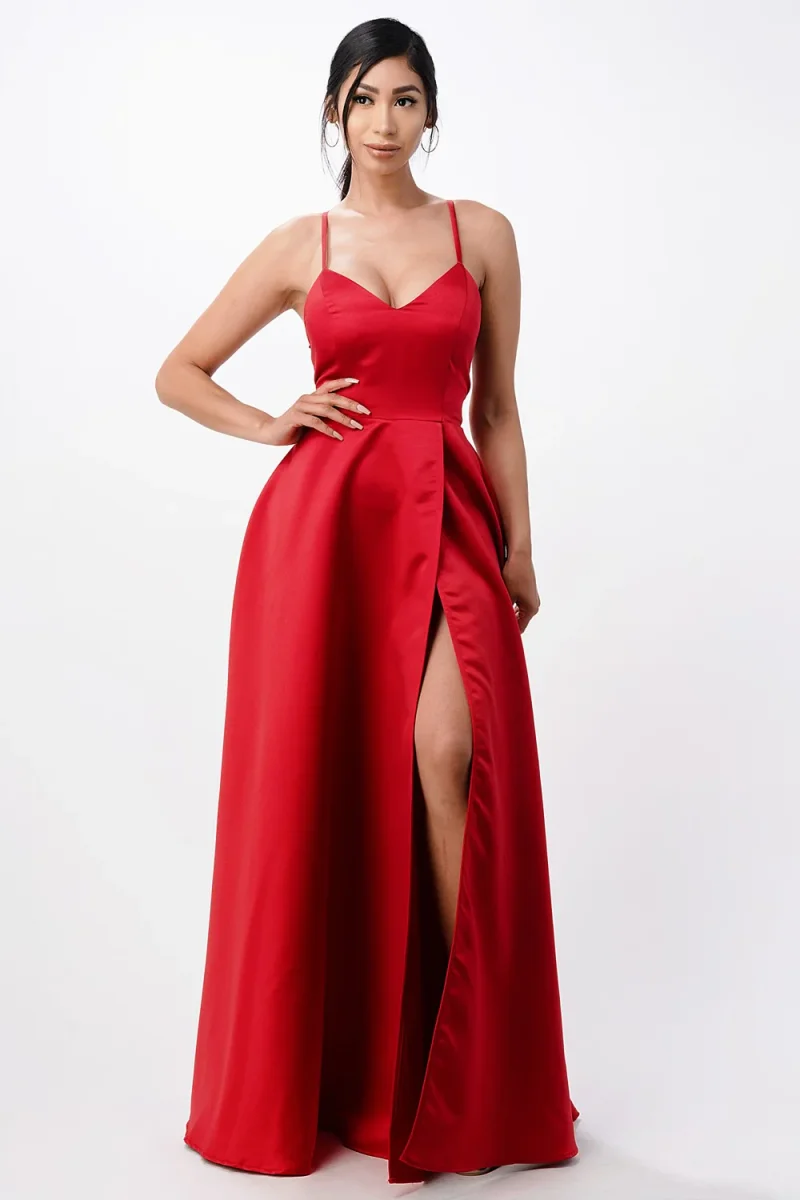 Picture yourself in this A-line satin dress, adorned with spaghetti straps that criss-cross to reveal an open back and a front leg slit. This sleeveless party dress is perfect for any special occasion.