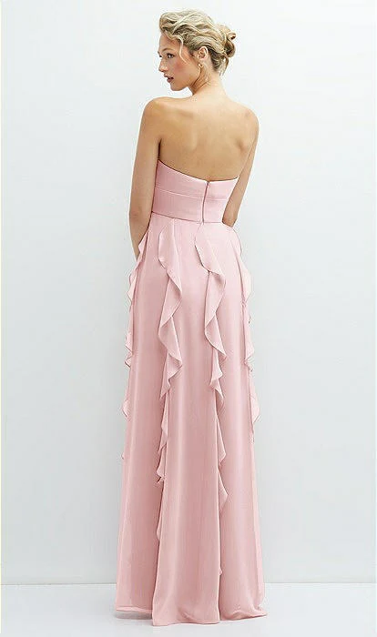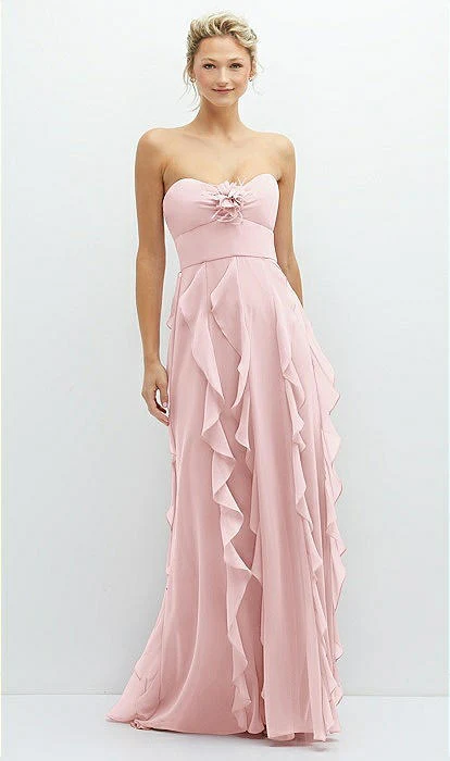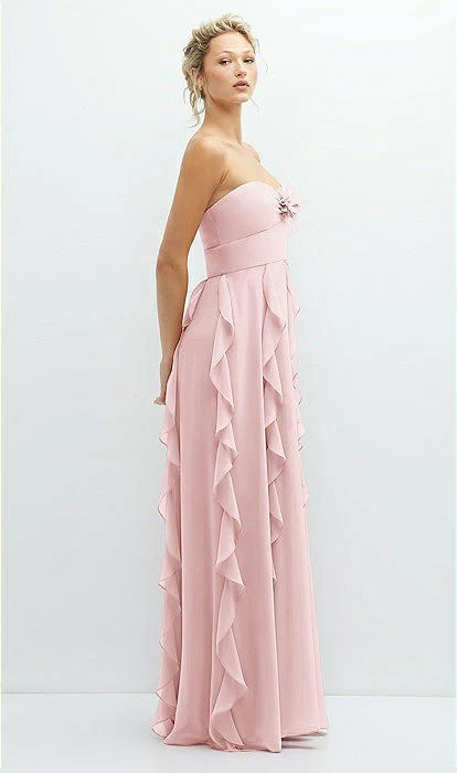 Avec diverses options pour se transformer en la robe de vos rêves, cette robe maxi en mousseline de luxe est un parfait point de départ pour un ensemble de mariage. Magnifique avec une esthétique haut de gamme, ses looks vont du glamour épaules dénudées avec des drapés à une version sans bretelles assurant une coupe flatteuse. Une fête de mariage semble élégante et confortable dans cette robe en mousseline de luxe avec un corsage sans bretelles rehaussé d’un détail floral assorti. Des volants verticaux en cascade descendent sur sa jupe ample, créant une impression de proportion et un look équilibré. Un décolleté basque doux et un corsage à coutures apparentes flattent une robe qui offre confort et proportionnalité avec une jupe fendue en cercle complet.
