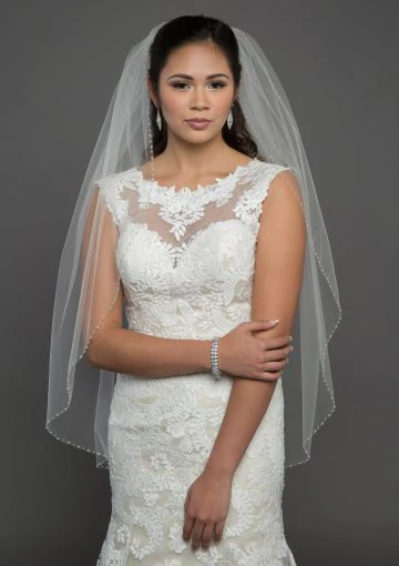 Découvrez ce voile orné de billes délicates en bordure, pour un look enchanteur qui ajoutera une touche d’élégance à votre tenue de mariée.