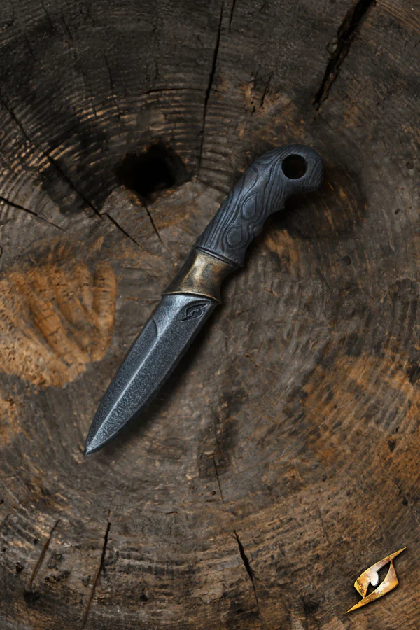 Couteau de lancer sans âme rigide en mousse à cellules fermées, conçu dans un style low-fantasy. Il dispose d’une lame en métal peinte et d’un manche imitation bois renforcé par des rivets. Un anneau au pommeau permet de l’accrocher facilement à la ceinture. Son revêtement en latex garantit un jeu GN sûr et réaliste, idéal pour vos sessions de jeu de rôle grandeur nature.