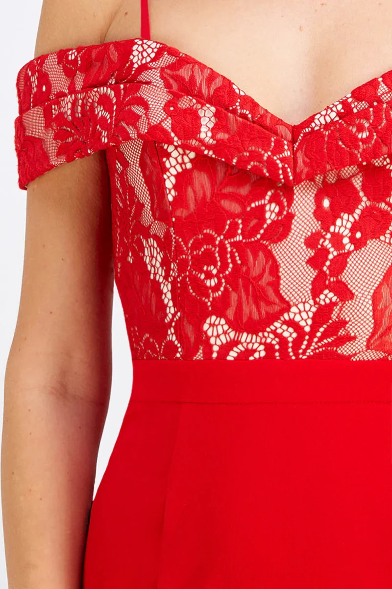 Robe au bustier décolleté garni de dentelle deux tons. Les épaules dénudées et la fente à la jupe offre un côté féminin sans pareil.